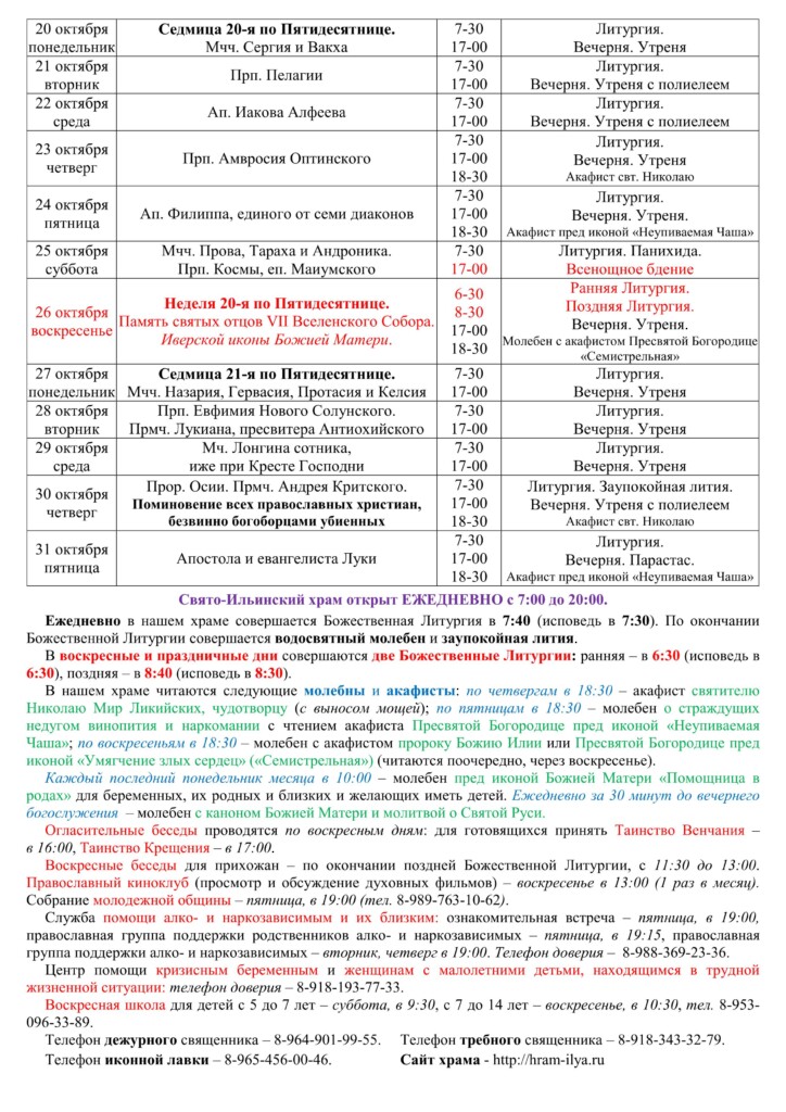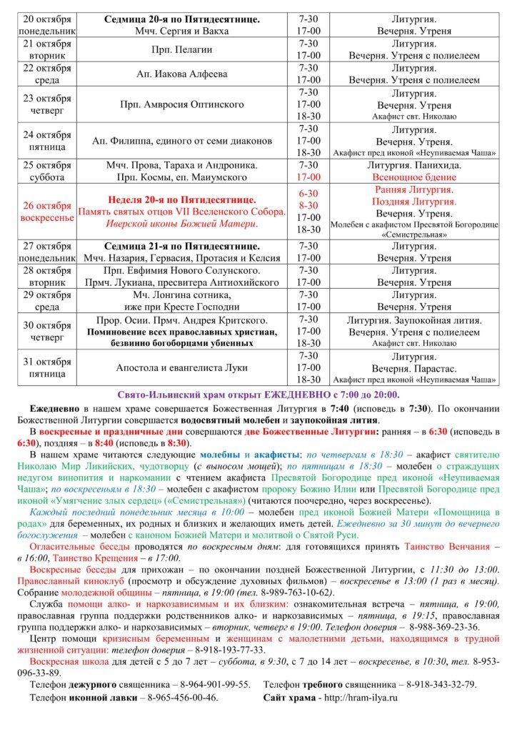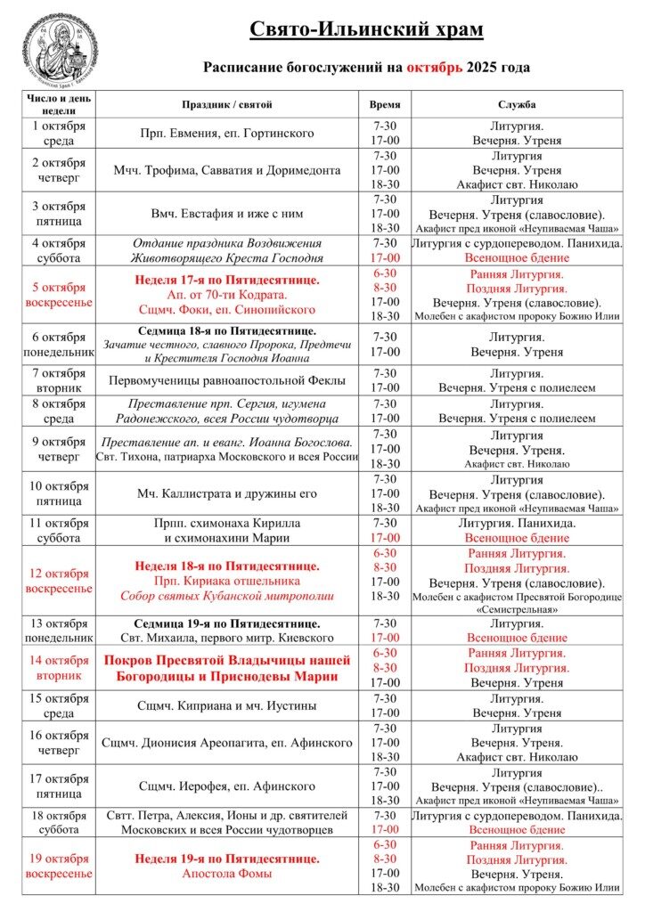 Скачать расписание на сентябрь одним файлом (pdf)Свято-Ильинский храм открыт ЕЖЕДНЕВНО с 7:00 до 20:00.