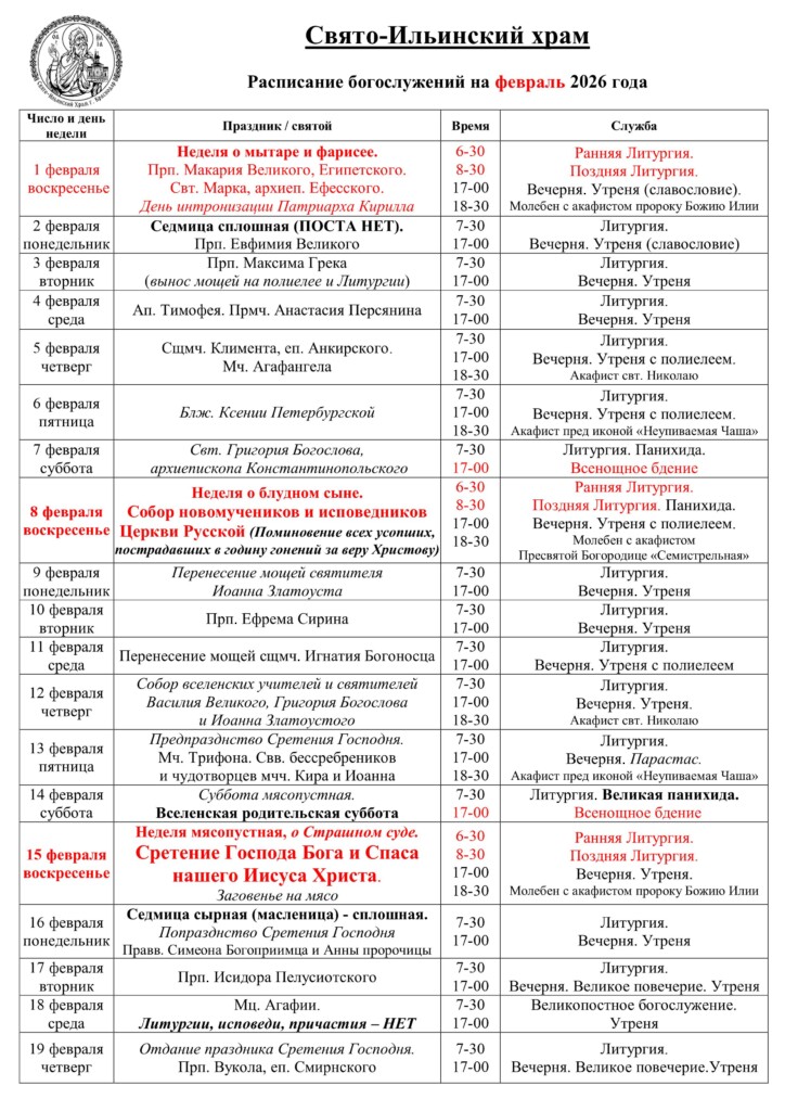 – по воскресеньям в 18:00 – молебен с акафистом пророку Божию Илии или Пресвятой Богородице пред иконой «Умягчение злых сердец» («Семистрельная») (читаются поочередно, через воскресенье).